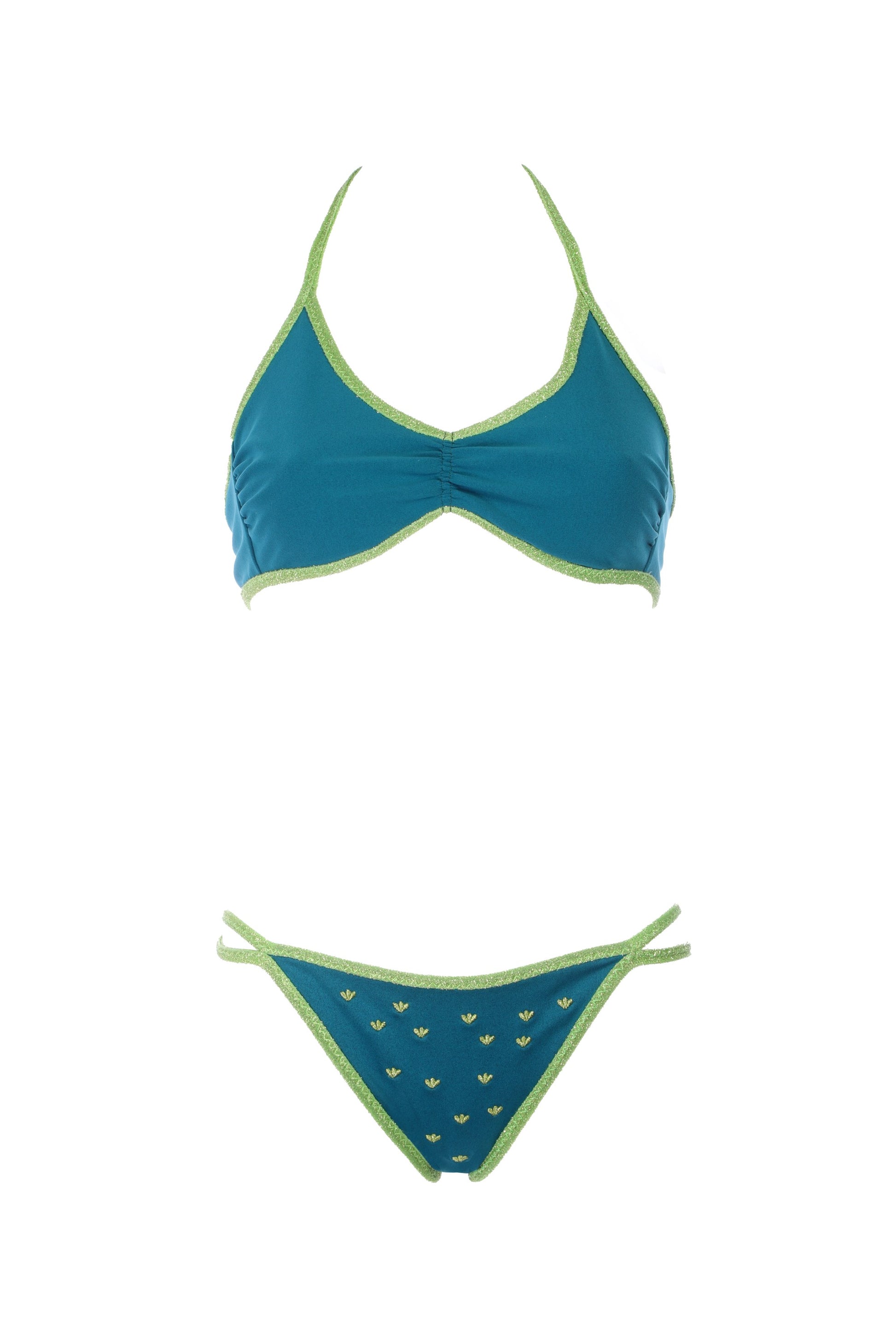 Bikini brassiere and briefs in deerskin fabric with embroidery and lurex edges