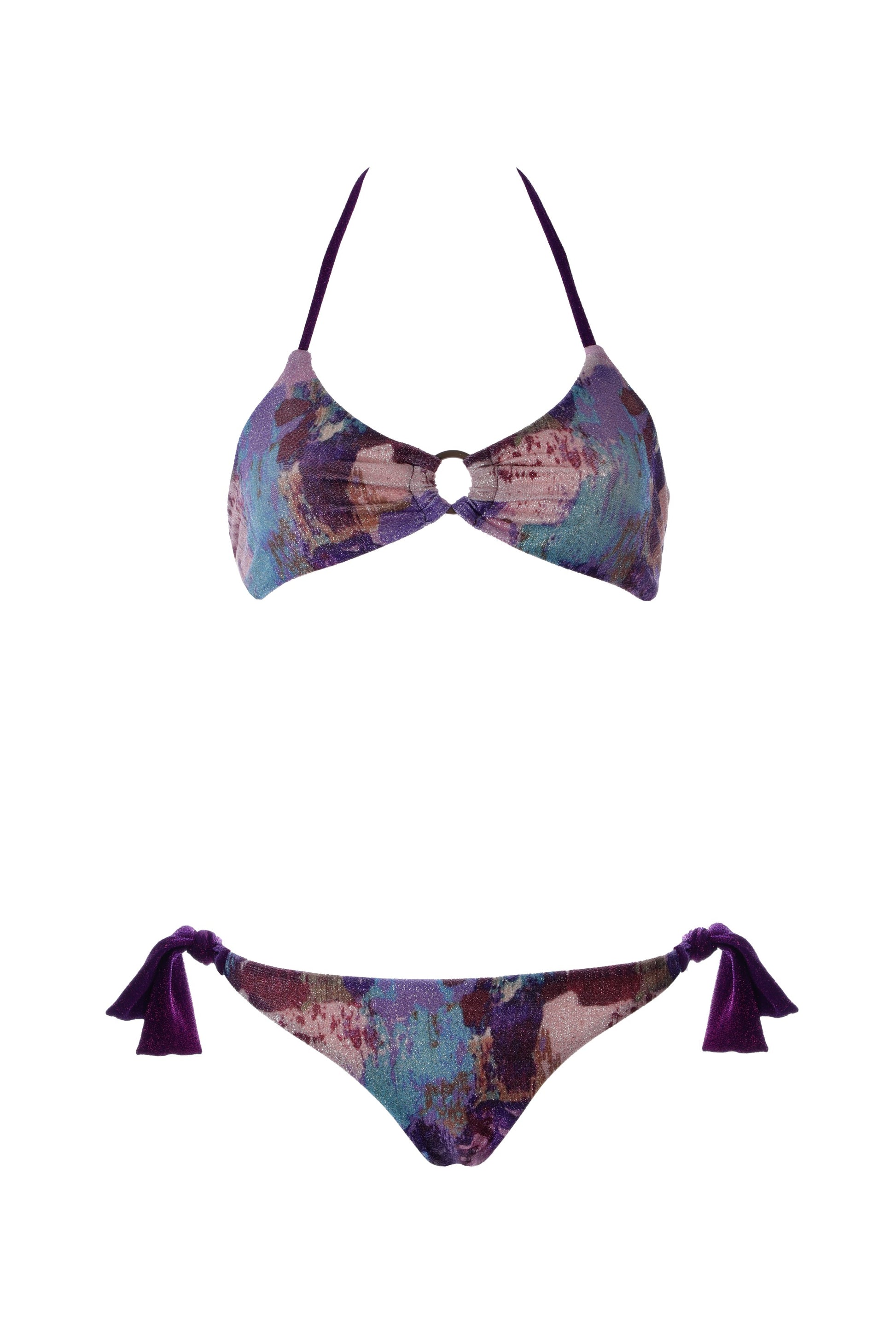 Bikini brassiere and briefs with patterned lurex bows