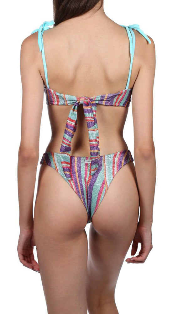 Bikini brassiere and high-cut briefs in multicolored lurex pattern