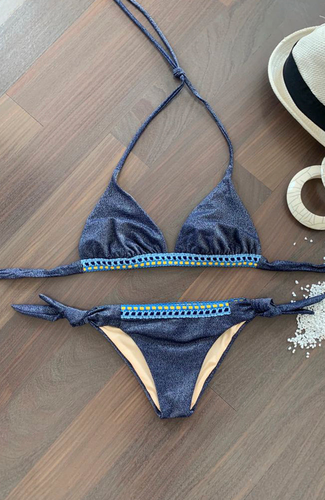 Triangle bikini and bow briefs in stretch lycra with lurex effect and trimmings